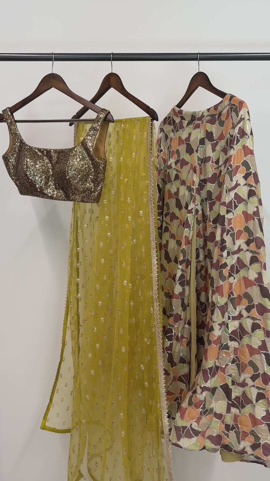 Put some spring in your step with this 'Late Bloomer Set'! This floral-patterned beauty has everything going for it – brown, green, and orange for a colorful look and double slits for a little extra flare to show off your moves. Paired with the cooper/gold sequins scoop bustier and dupatta makes for the perfect fall outfit!
